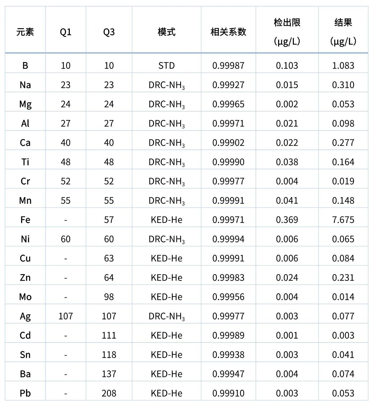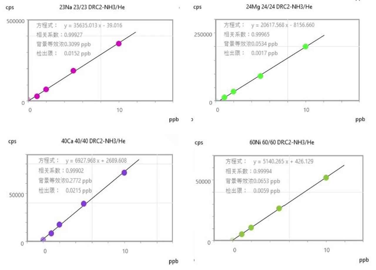 检测结果所示,待测元素的标准曲线相关系数均大于 0.999,线性良好,满足痕量元素定量分析的基本要求;背景等效浓度(BEC)与检出限(DL)处于极低水平,其中 Cd、Cr、Mo、Ag 等元素检出限低至 0.001~0.004 μg/L,Na、Mg、Ni 等关键催化剂毒物检出限也均低于 0.022 μg/L。