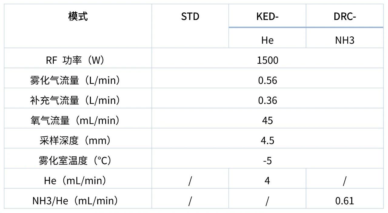 LabMS 5000 ICP-MS/MS配备石英雾化器、带有控温附件的石英雾化室、石英炬管及中心管、Pt采样锥和截取锥。在本实验中,采用多种碰撞反应池气体(He、NH3)。详细仪器参数如表1所示。