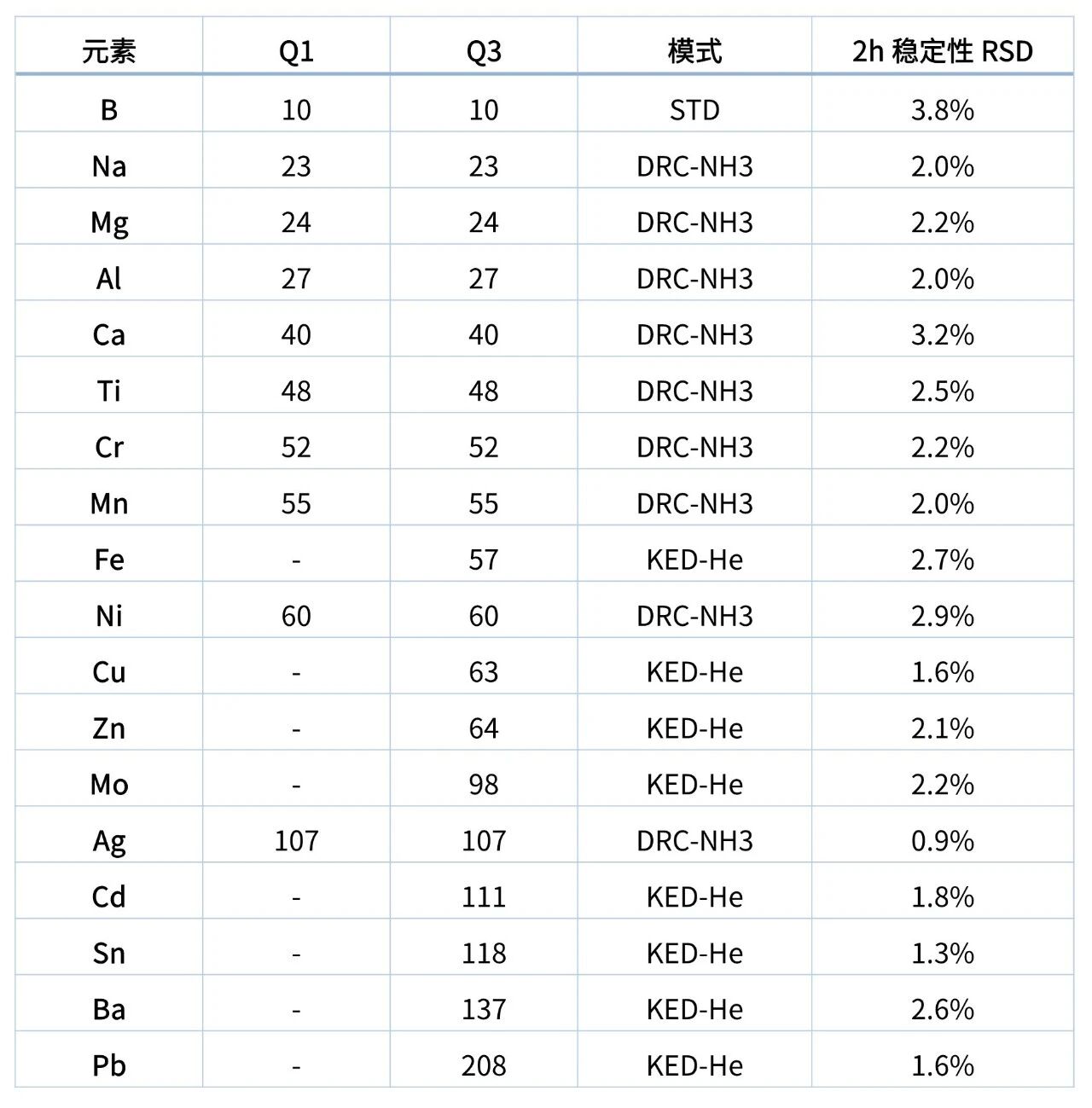 为评估该系统的稳定性(进样系统、等离子体和干扰消除),使用5μg/L加标样品进行2小时连续分析,计算各元素相对标准偏差RSD,来进行稳定性分析,如表3。